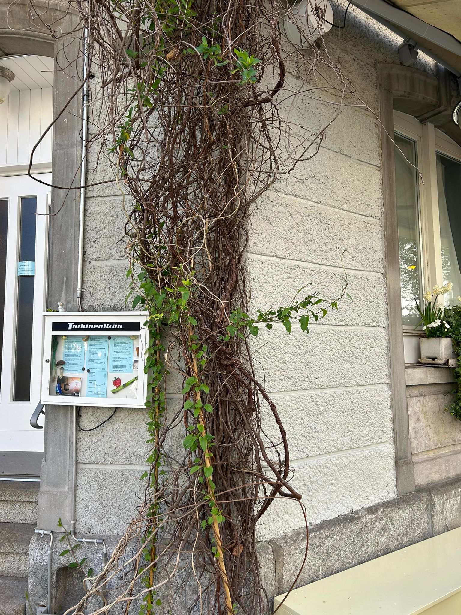 Graffiti bei gestrichener Fassade teilweise gereinigt oder mit Isoliergrundfarbe überstrichen