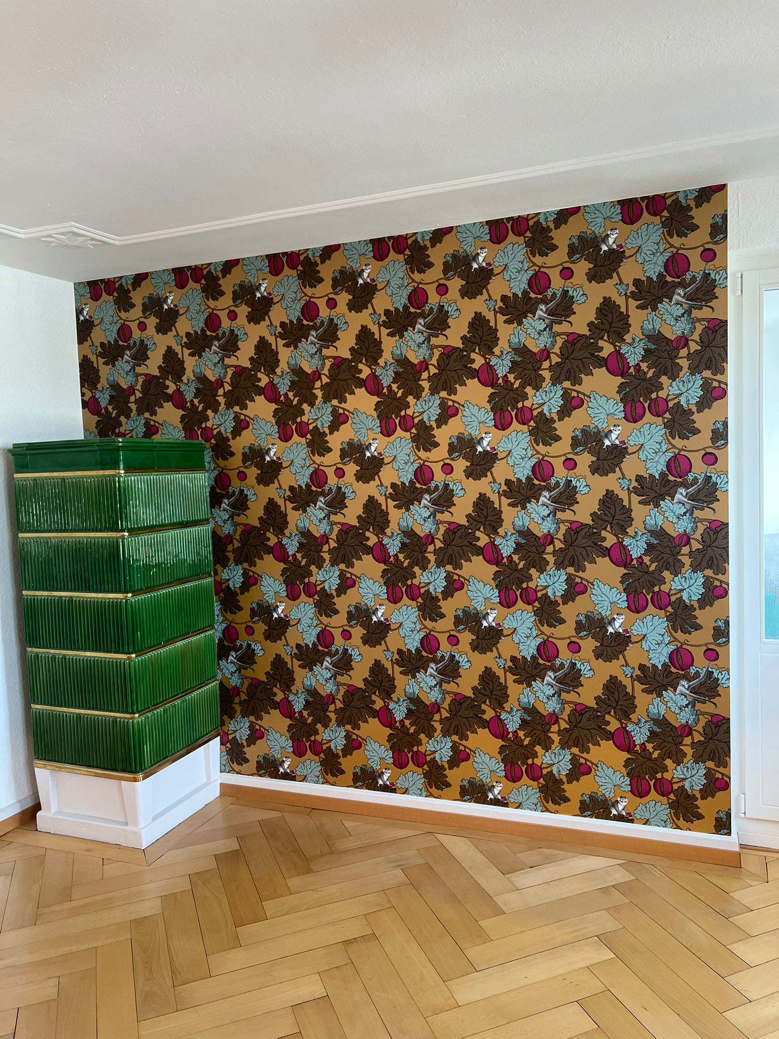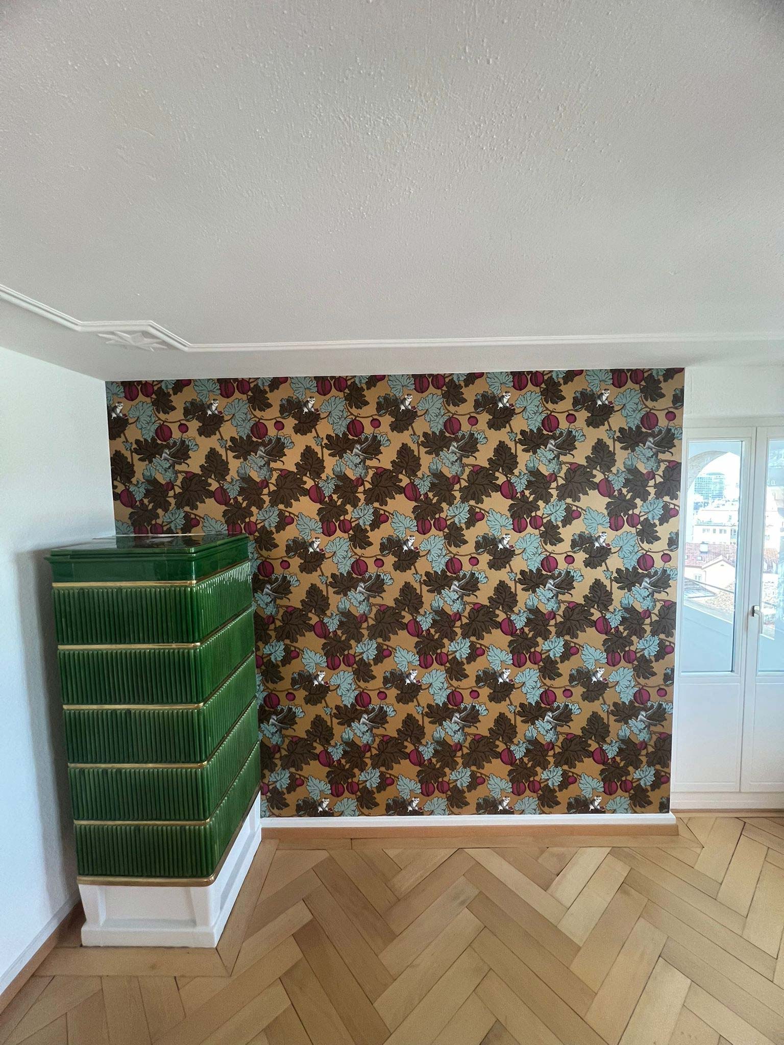 Für einen Privatkunden haben wir in einem älteren Einfamilienhaus eine auffällige, florale Mustertapete fachgerecht verarbeitet – stilvoll kombiniert mit klassischem Parkett und Kachelofen.
